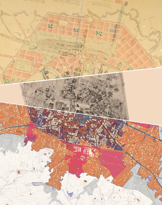 Per il Piano regolatore del 1889 il centro storico è la città esistente, rappresentata con isolati pieni in grigio e monumenti in nero; tutto il resto, il reticolo di strade bianche con isolati rosa, è “ampliamento”, la città che crescerà nel futuro.